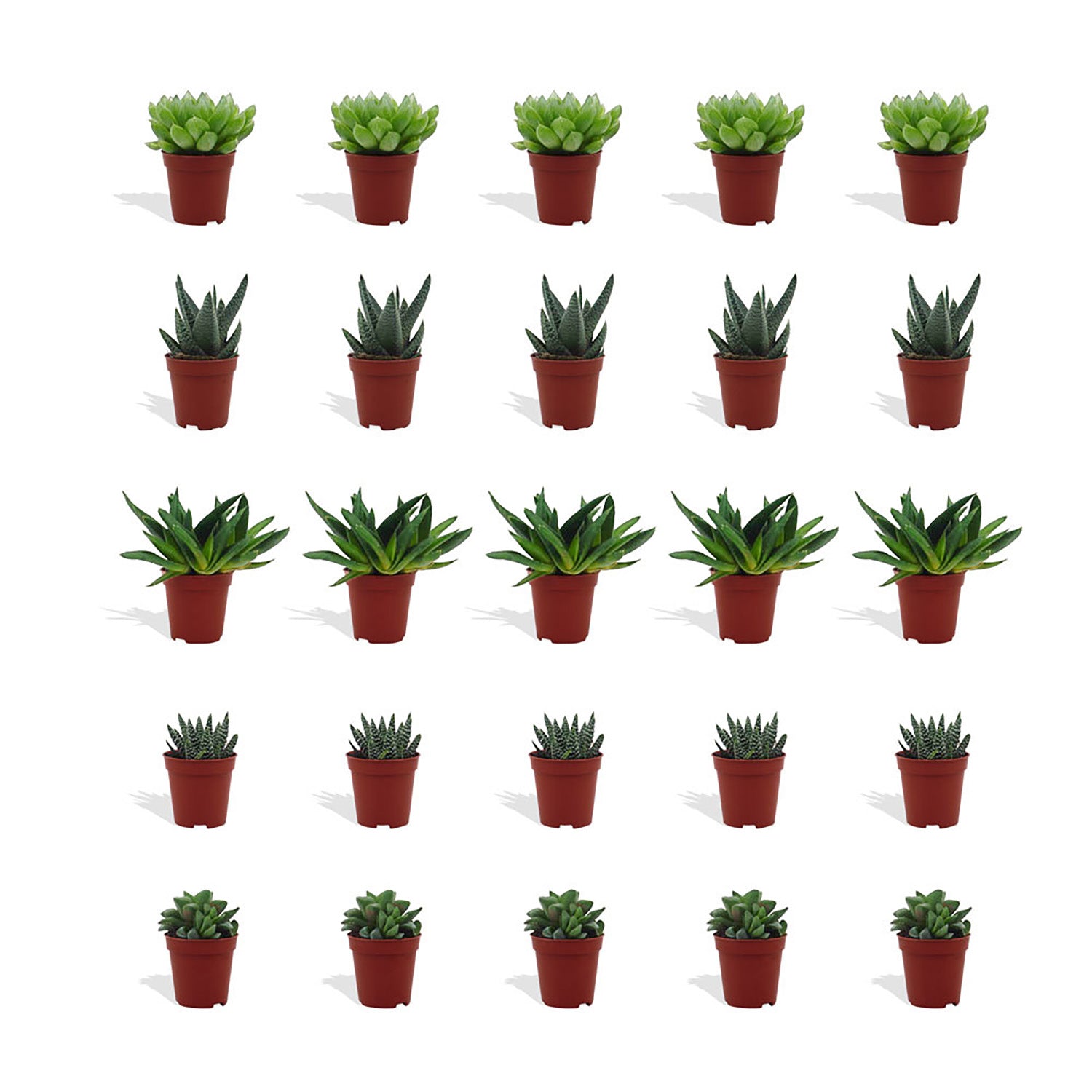Onze boxen met Haworthia vetplanten bevatten een zorgvuldig samengestelde mix succulenten, rechtstreeks afkomstig van een gespecialiseerde kweker. De exacte soorten die je ontvangt, variëren per seizoen, waardoor elke box een unieke verrassing is. De Haworthia staat bekend om zijn compacte groei, dikke bladeren en bijzondere patronen, wat hem een stijlvolle toevoeging maakt voor je bureau, vensterbank of in horecagelegenheden. Dankzij zijn robuuste aard en gemakkelijke verzorging is deze plant perfect voor iedereen, of je nu groene vingers hebt of niet.