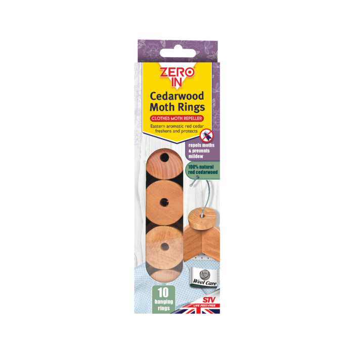Cedarwood Moth Rings from Zero In® work effectively to repel adult moths and their larvae. Eastern aromatic red cedar has been trusted to freshen and protect clothes for centuries. This product is 100% natural red cedarwood. Its pleasant fragrance will penetrate garments and fabrics, repelling moths as well as helping prevent mildew and mustiness from drawers, wardrobes and storage units.