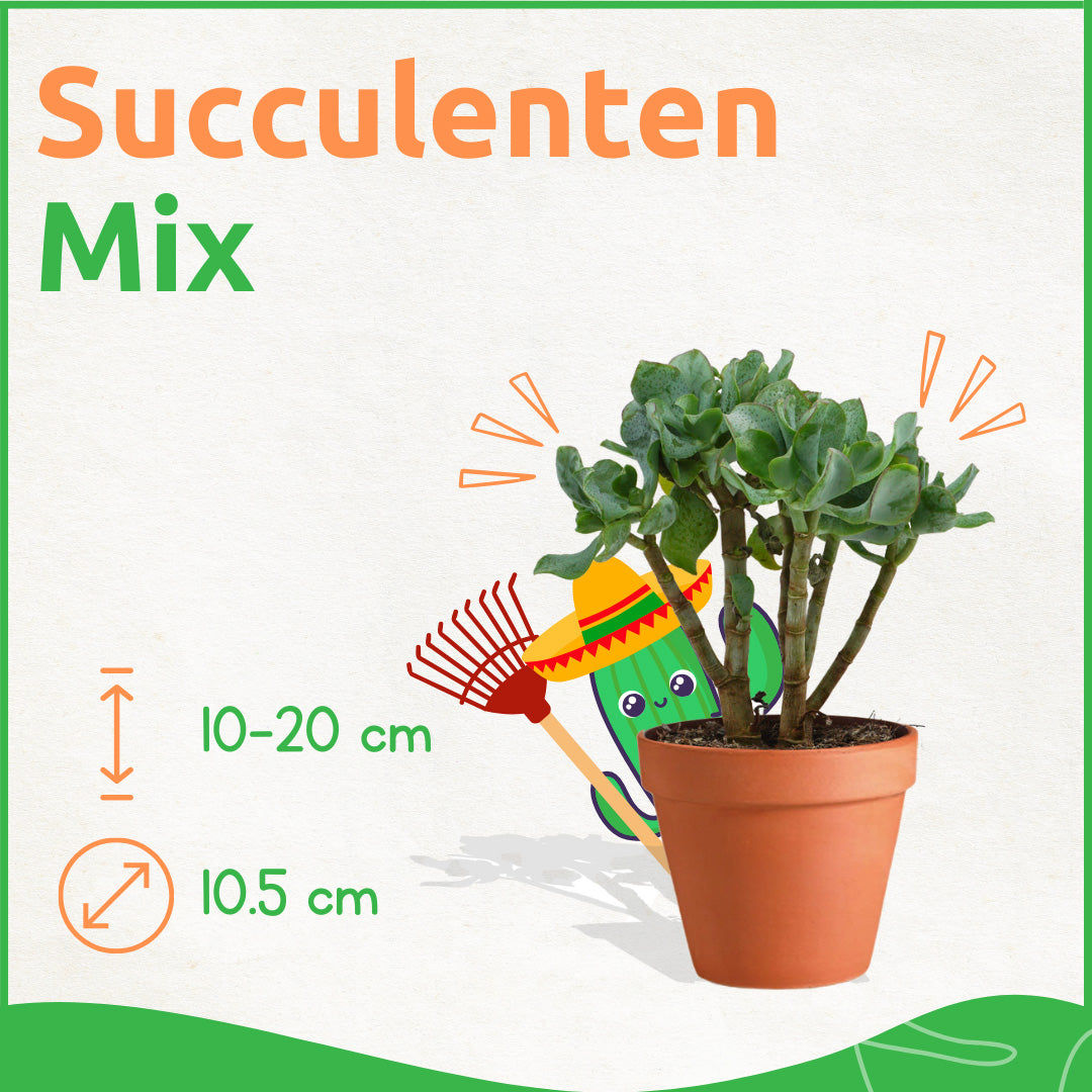 Onze boxen met vetplanten bevatten een gevarieerde mix van robuuste en decoratieve succulenten, rechtstreeks afkomstig van een gespecialiseerde kweker. Je weet van tevoren niet precies welke soorten je ontvangt, maar wij garanderen altijd een prachtige en diverse samenstelling. Dankzij hun stevige, wateropslagende bladeren zijn deze vetplanten perfect voor elk interieur, van woonkamers en kantoren tot restaurants en hotels. De succulenten passen mooi in potten, plantenbakken of creatieve decoratiestukken en zijn daarnaast uiterst onderhoudsvriendelijk - ideaal voor zowel ervaren plantenliefhebbers als beginners!