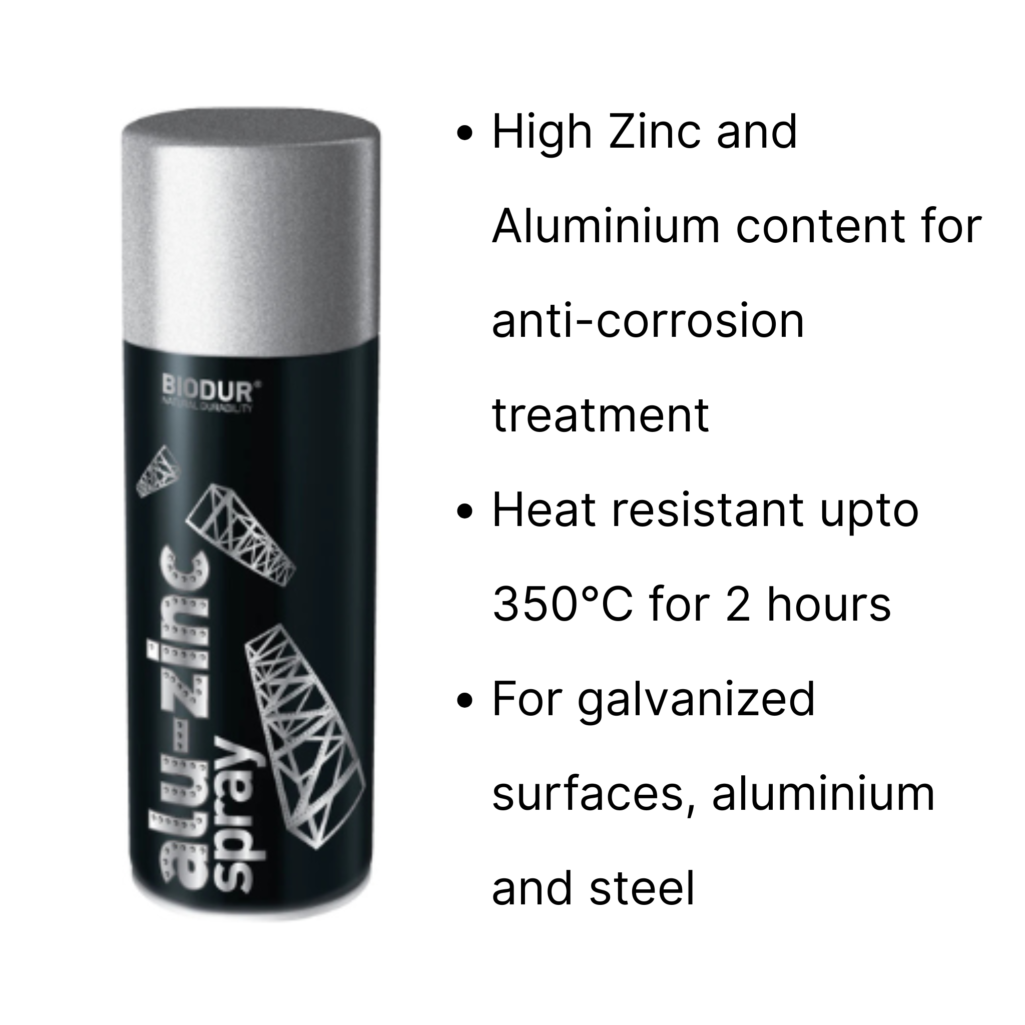 Protect and restore metal surfaces with our high-zinc, high-aluminum spray. Perfect for galvanized steel, aluminum, ferrous and non-ferrous metals, it forms a strong, glossy coating that resists rust, weather, UV, oils, saline solutions, and high temperatures. Ideal for repairs, drill holes, cut edges and spot welding.